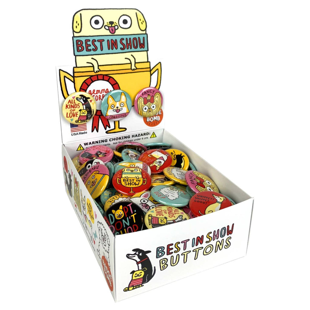 A variety of Best in Show buttons for your favorite dogs! 120 buttons, 16 designs, 1.25" buttons by Gemma Correll.