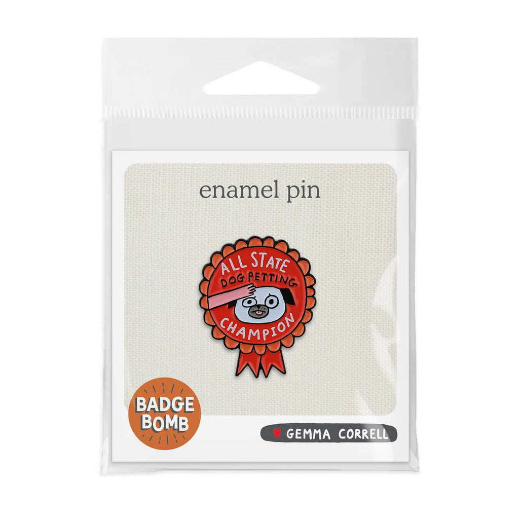 Dog Petting Champion Enamel Pin by Gemma Correll. Wear it, flaunt it, and let the world bow down to your dog-petting prowess!