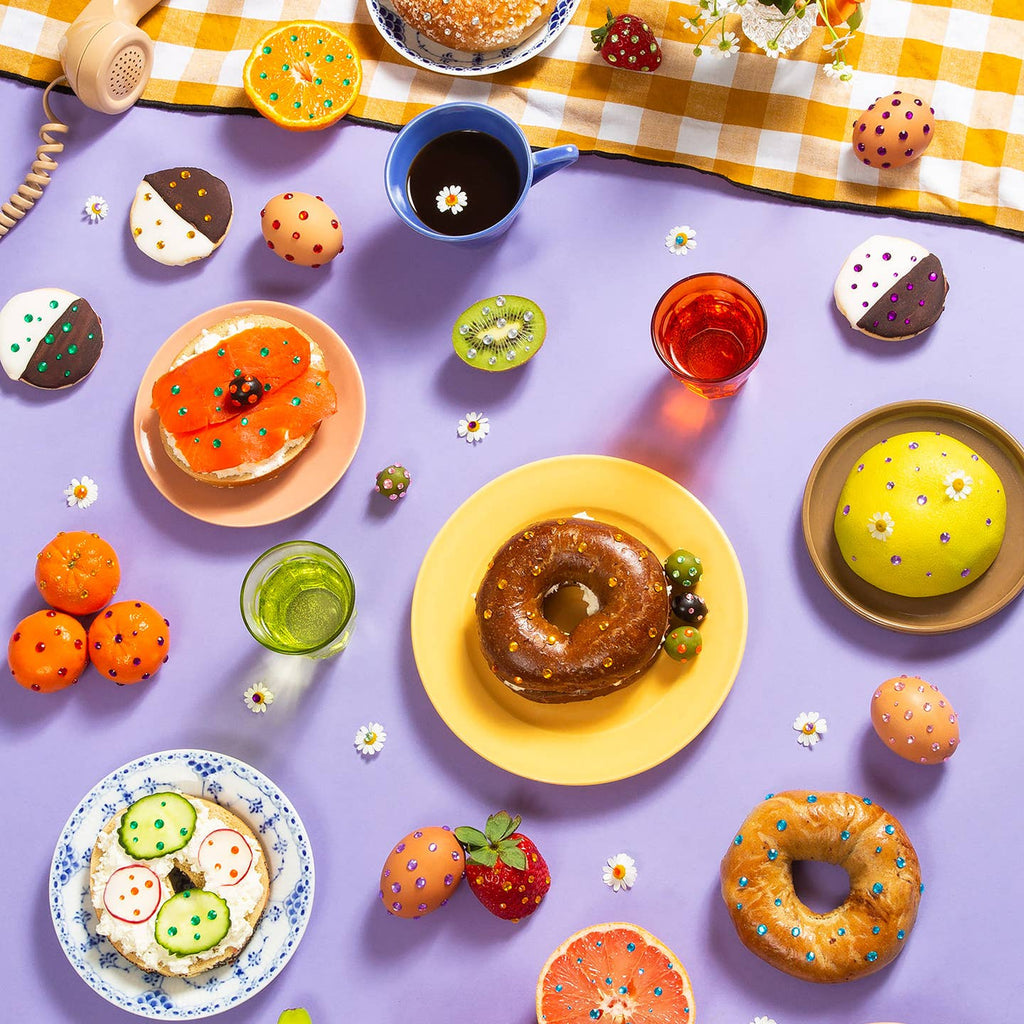Sparkly strawberries. Bedazzled bagels. Rhinestoned olives. Tiny, tiny daisies. This smorgasbord is truly the breakfast of champions. It’s just like the old saying: all that glitters is...a truly delightful brunch puzzle.
