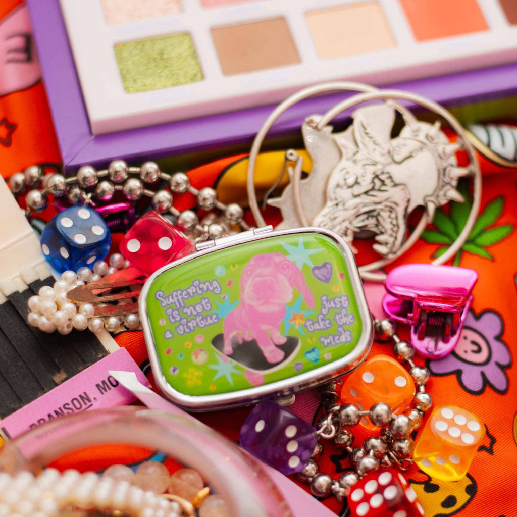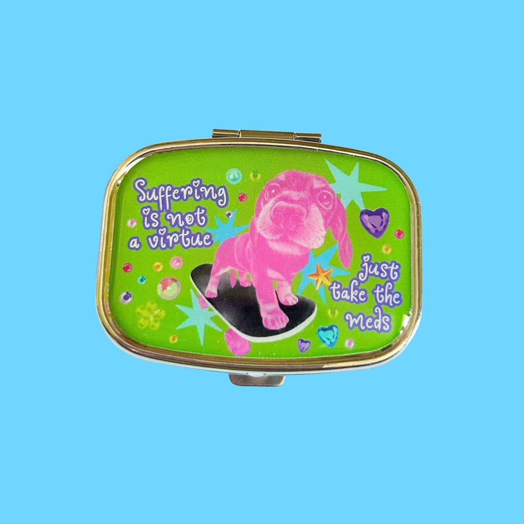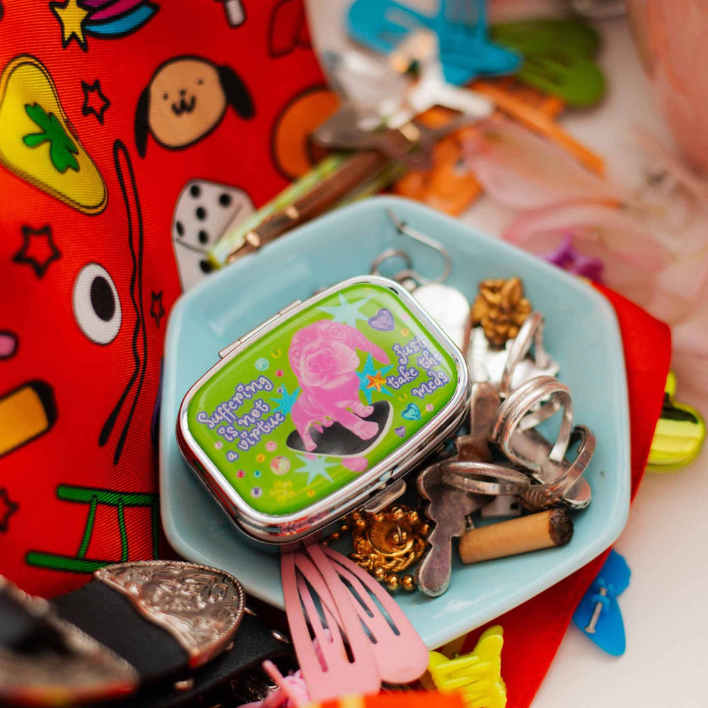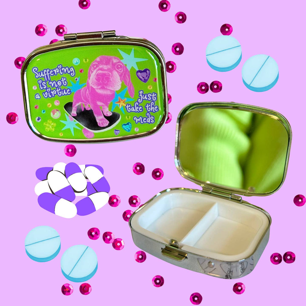 Never be without your meds again! This portable pill container is perfect for bringing your lactaid and ibuprofen with you wherever you go! It has a secure closure to prevent spills, a divided internal space to keep things organized, and even has a mirror in the lid!