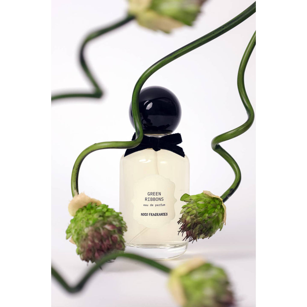 Fog drifts through a mossy forest where vines climb old stone in playful spirals resembling green ribbons. The air is cool and green, bright with cardamom husk and the sharpness of fresh pith. Waxy leaves glisten with dew, softened by orris. A trace of an iron gate settles beneath the greenery, grounded by cedar sap, sandalwood, and tonka.