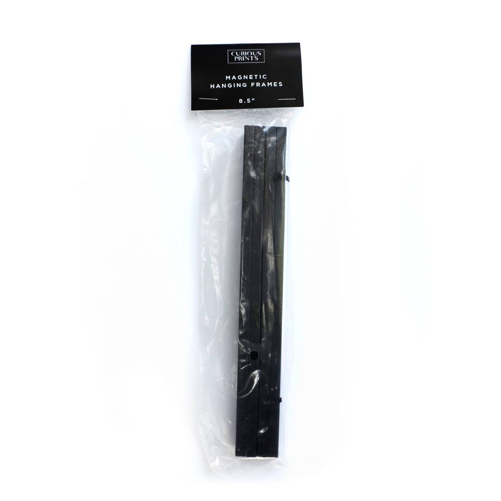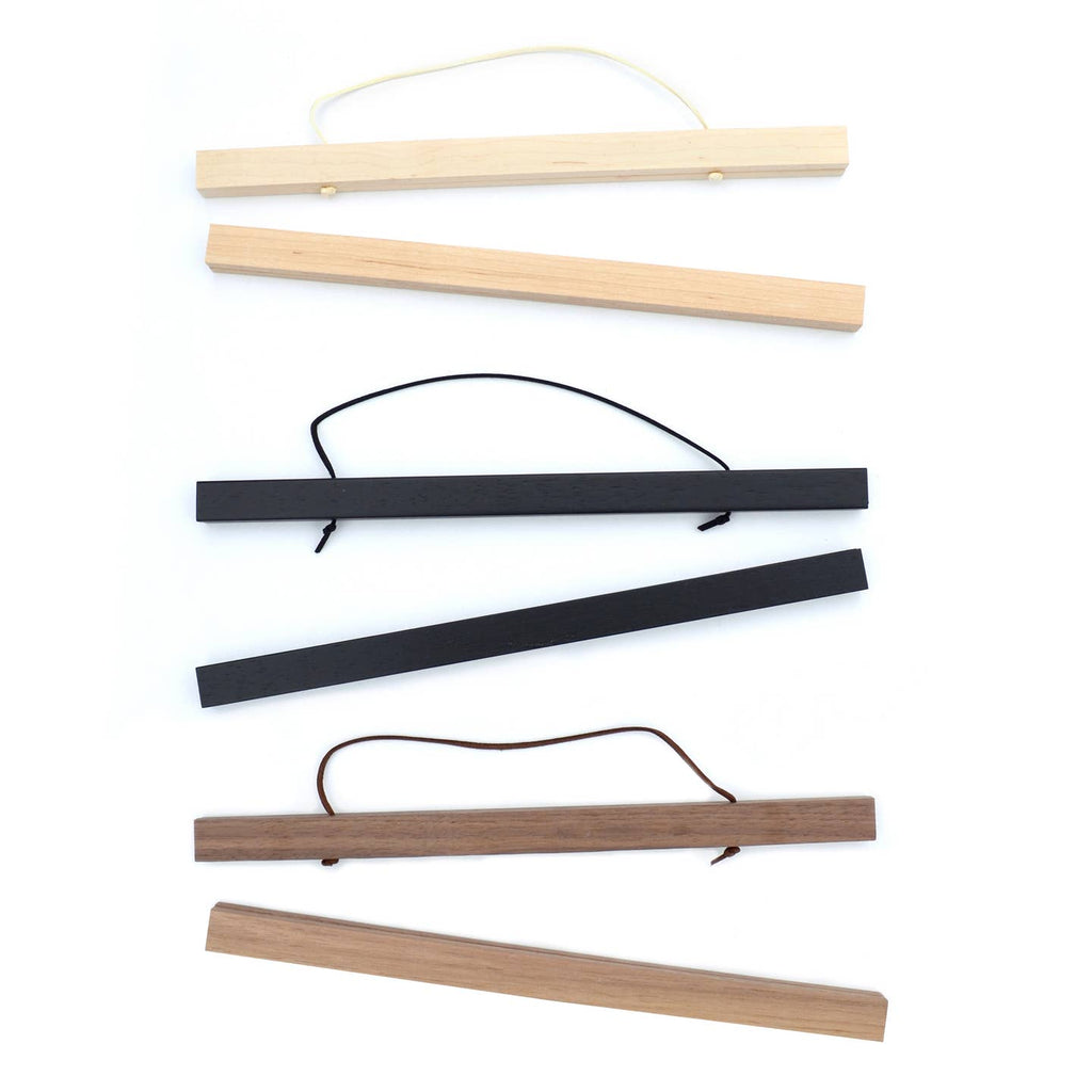 The frame set includes 4 sticks, 2 clamping the top of paper and two clamping the bottom. Neodymium magnets are embedded, keeping the art damage free and allowing you to change out the art at any time! Our magnets are strong enough to hold the print in the packaging with mat backing so they stay protected while displayed in your shop. The frame set comes with suede hanger attached. Natural wood stained in ebony (black).
