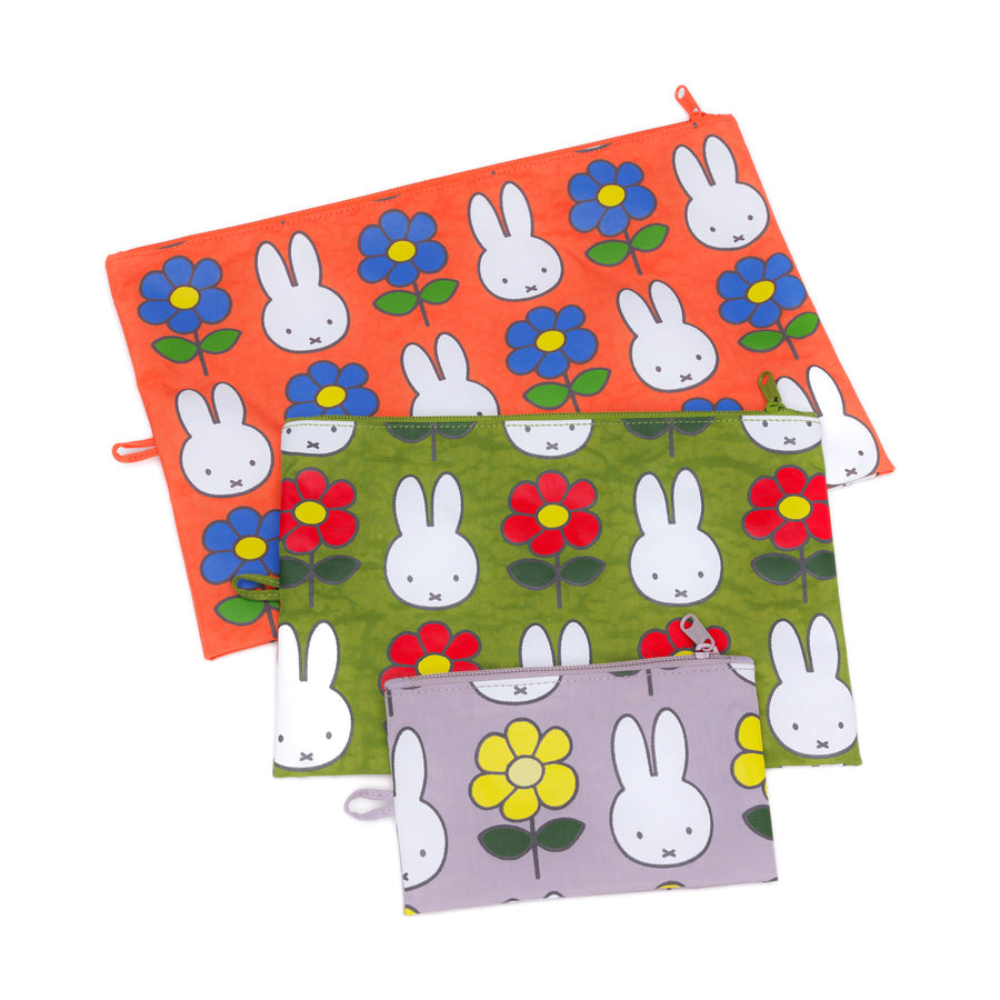 Baggu's Go Pouch Set makes it easy to keep your bag neatly packed and organized. Whatever you're toting—coins, chords, or an extra pair of shoes—this set of three all purpose pouches keeps it together. They expand to hold your essentials and lay flat when not in use.