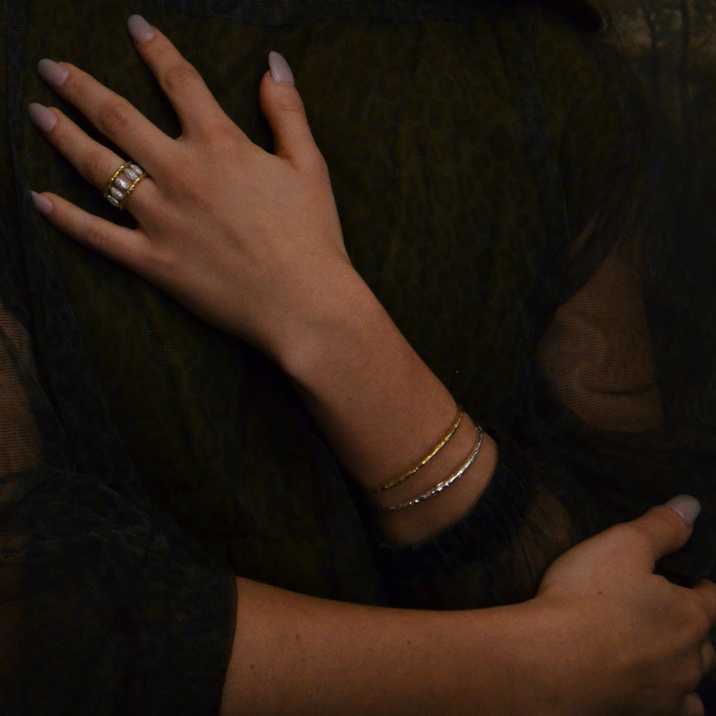 The Iaera Cuff Bracelet is inspired by the ethereal sea nymphs of Greek mythology. Textured to emulate the gentle dance of water rippling in the sunlight. Handcrafted in sterling silver. Made in the USA.