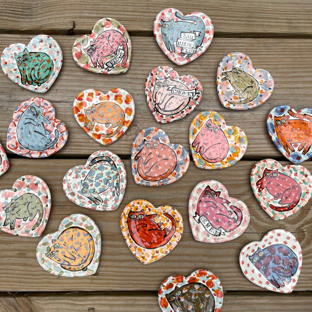 Each ceramic plate is cut, shaped and painted by hand. Cats are always in assorted colors and patterns.
