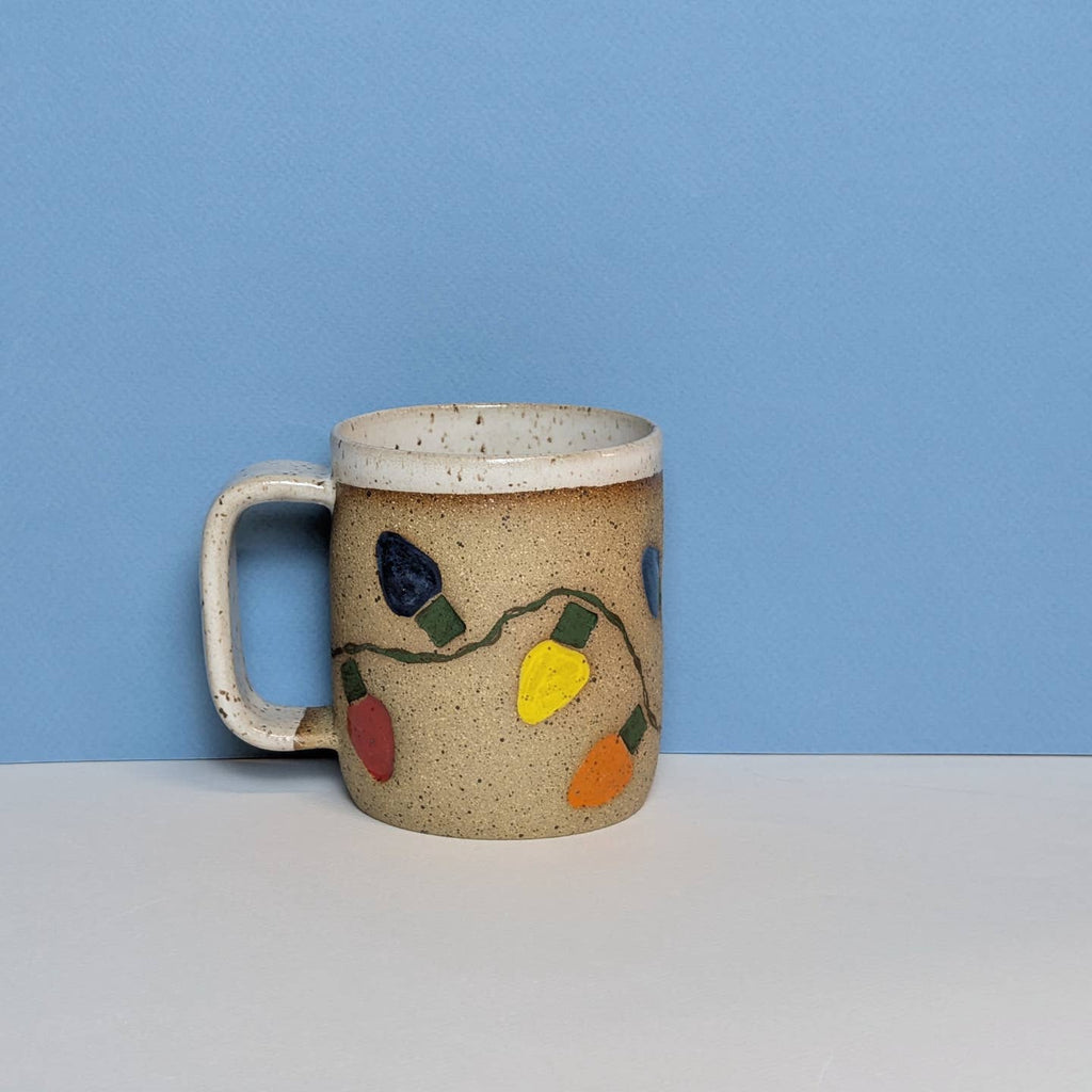 A mug for the holiday season! This mug was thrown on the wheel and then stamped with my vintage inspire holiday light stamp. The lights are in red, orange, yellow, and dark blue and are glossy. They are connected by hand painted matte green wire, and circle the whole mug. The interior, lip, and handle are glossy white.
