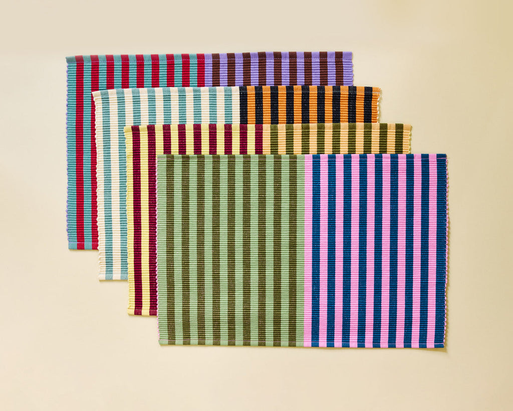 100% cotton. Cotton placemats in tri-color stripes with a ribbed texture. Made in India.