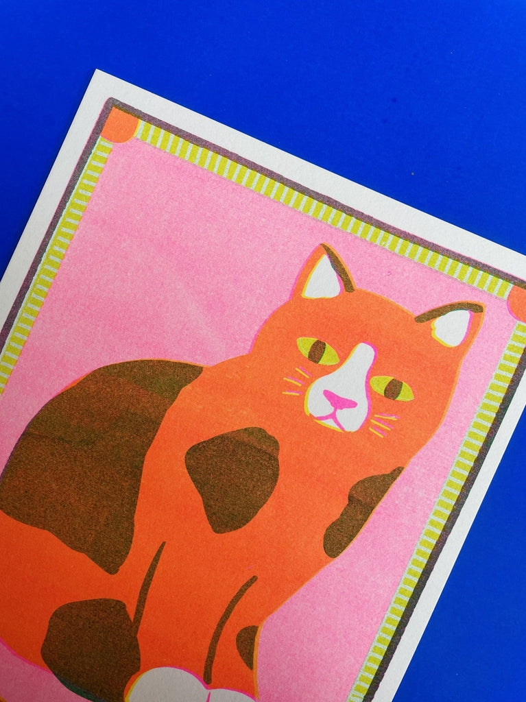 Risograph print featuring a slighty grouchy orange and black cat printed in the using soy based environmentally friendly inks on recycled paper stock