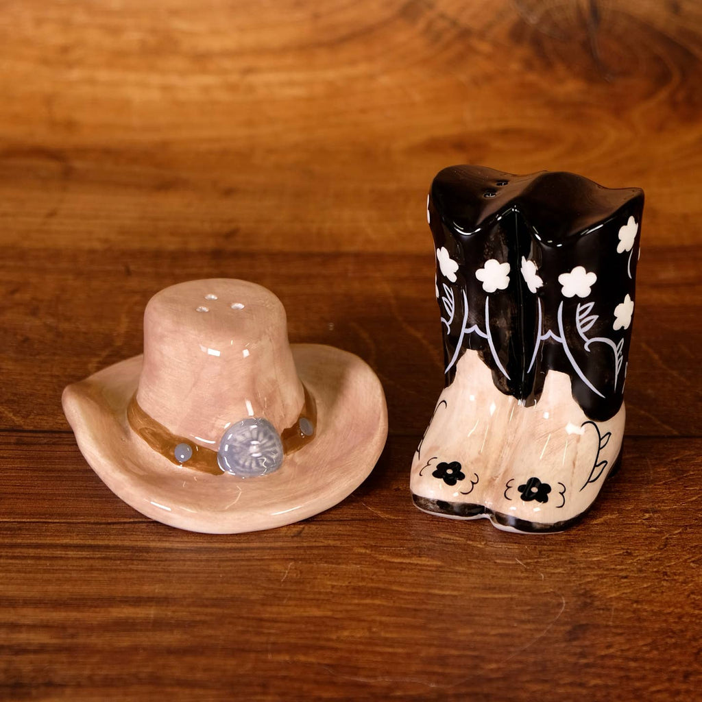 This hand-painted ceramic duo features a classic tan cowboy hat with silver buckle detail and a pair of black boots decorated with white floral accents. Perfect for everyday use or as a conversation piece, these shakers combine functionality with rustic charm. A delightful gift for collectors or anyone who loves a country-inspired kitchen! 🧂