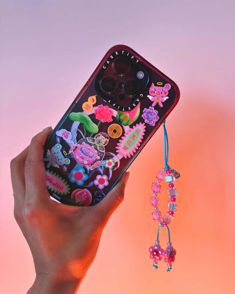 This floral finger loop charm features delicate pink blossoms, symbolizing good luck and fresh beginnings. A beautiful and lightweight phone accessory for charm lovers.