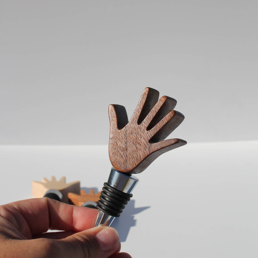 Inspired by the iconography of Lotería cards, this bottle stopper has been cut by hand from wood into a hand shape and screwed atop a stainless steel stopper.