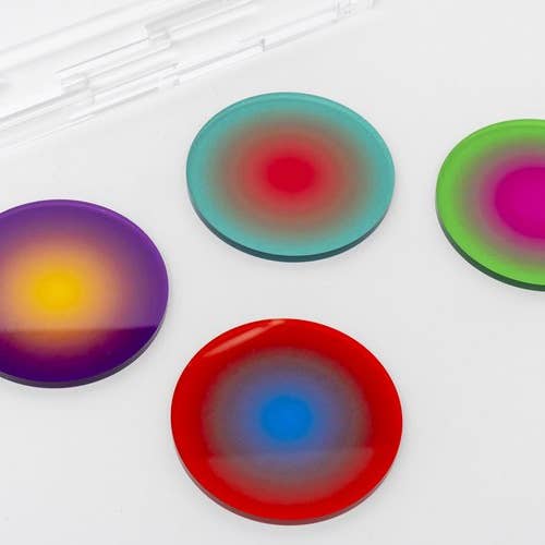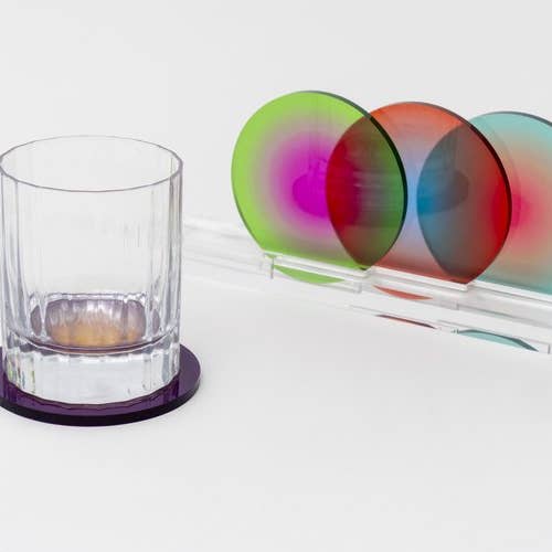 The Gradient Coasters are a set of four acrylic coasters designed by Portugal-based graphic artist Yoni Alter, complete with a clear display stand. Each coaster measures approximately 4″ (9 cm) in diameter and features a gradual color shift—creating a sculptural, playful setup whether stacked or displayed. Coated with a protective micro-layer, they make a visual statement whether used under drinks or left on view. Ideal for style-conscious desktops, modern dining tables, and art-minded gift recipients.