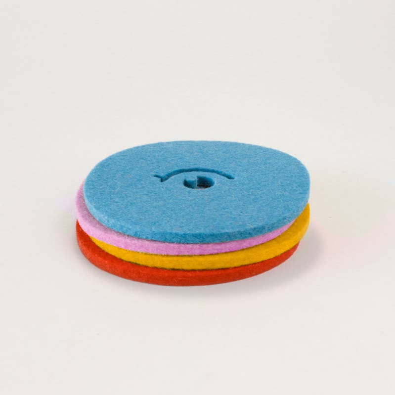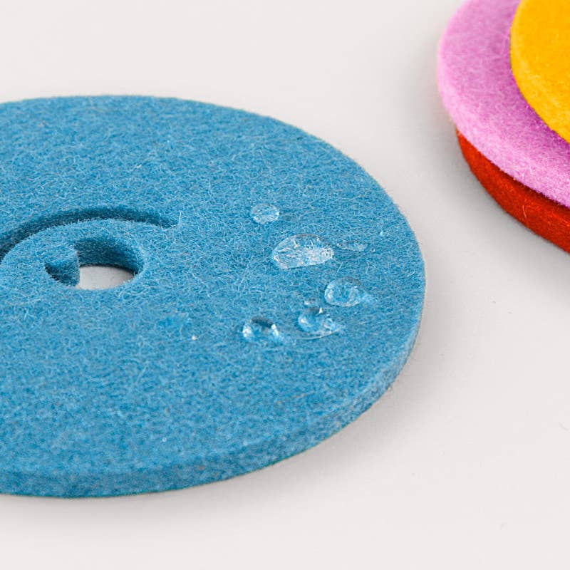 The Picasso coasters are a whimsical take on table protection. Four distinct shapes make up an abstract cubist face. An eye, a wink, a mouth, a nose. A little silly, yes, but they take their job very seriously. Thick, high-density merino wool wicks up condensation; evaporating it before it reaches the furniture surface.