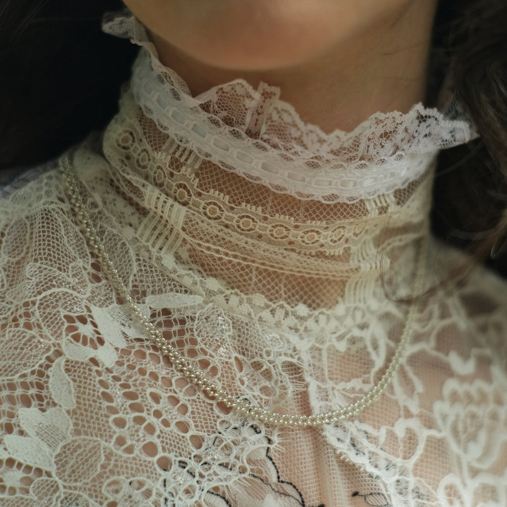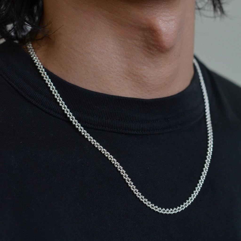 The Orbitae necklace is modern chain that features tiny interconnected orbs that symbolize the celestial bodies and their eternal dance in the cosmos. Sterling silver 4mm wide satellite style curb chain necklace. Available in 16”.