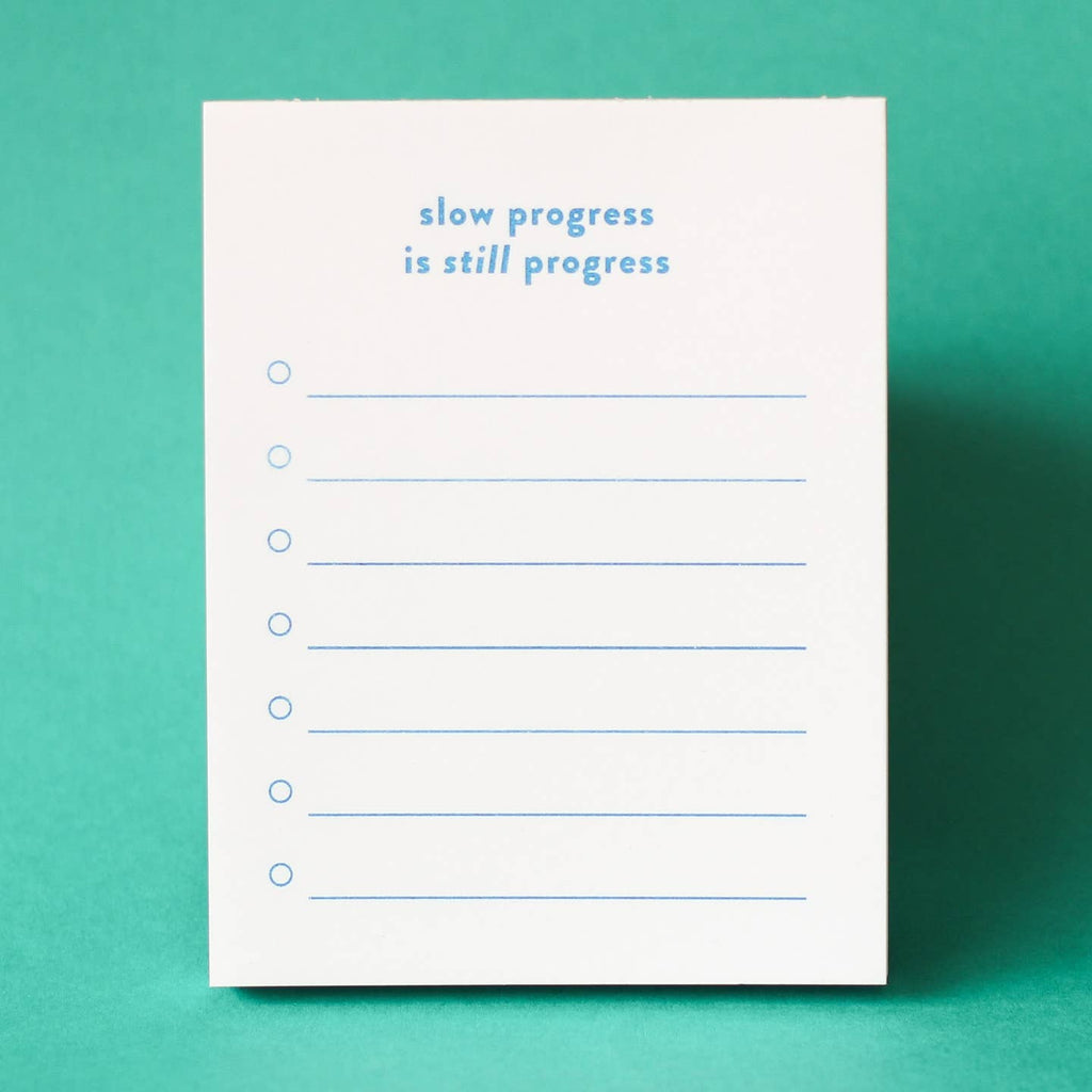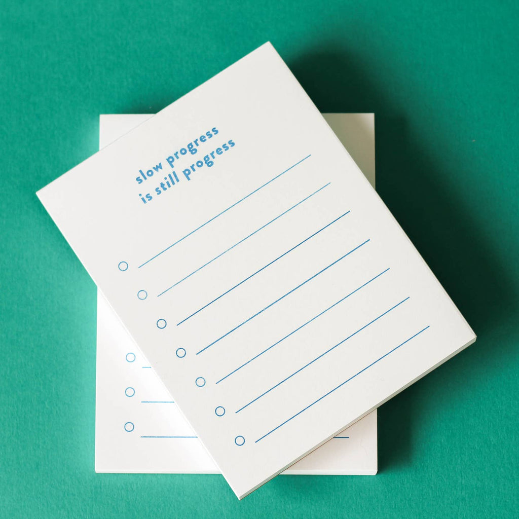 Your daily checklist should include only seven things to maximize productivity, or at least that's what we heard. With a tendency to overload, we created this small notepad to keep ourselves in check; we included a helpful reminder: slow progress is still progress.
