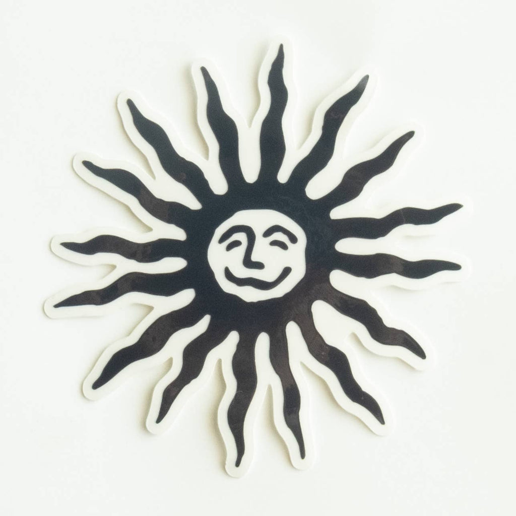 Introducing our "Smiling Sun" Vinyl Sticker. 3x3 inches in size, and designed with durability in mind, this high-quality sticker features a sleek black smiling sun on a transparent background, adding a touch of summer charm to your belongings.