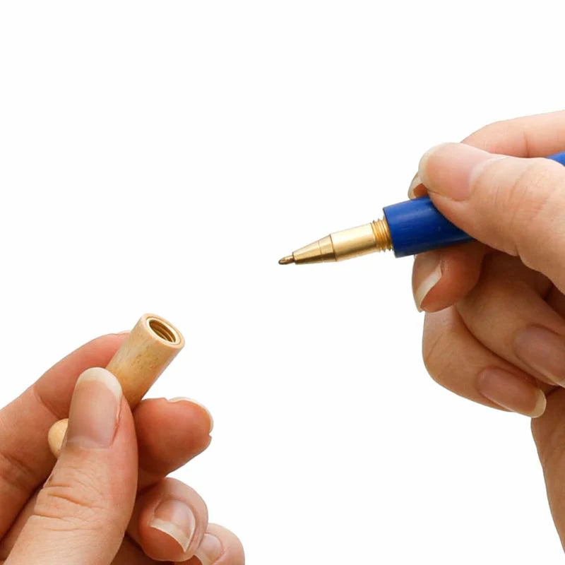 A wooden baseball bat pen by Penco. The bat handle acts as the cap, and the pen tip is made of brass. Comes in black oil-based ink with 0.8mm tip.