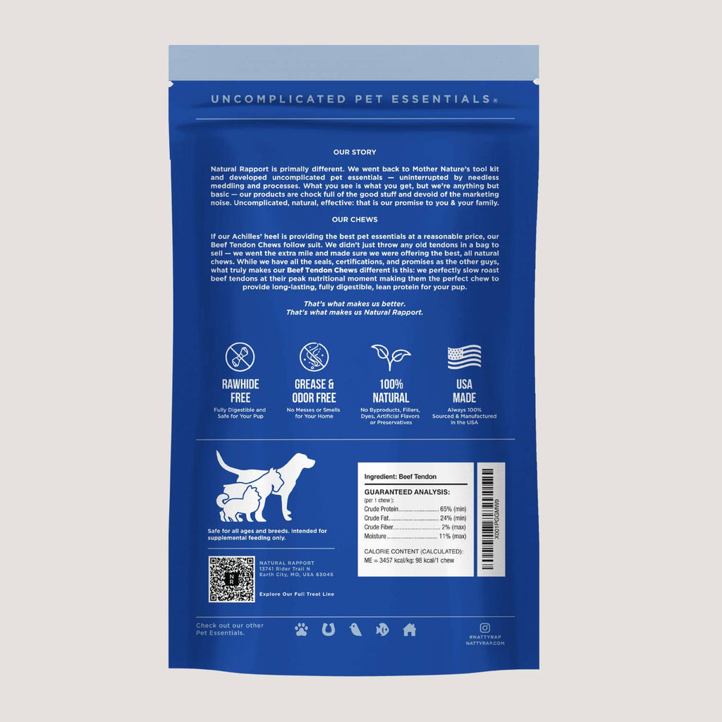 If our Achilles’ heel is providing the best pet essentials at a reasonable price, our Beef Tendon Chews follow suit. We didn’t just throw any old tendons in a bag to sell — we went the extra mile and made sure we were offering the best, all natural chews. While we have all the seals, certifications, and promises as the other guys, what truly makes our Beef Tendon Chews different is this: we perfectly slow roast beef tendons at their peak nutritional moment making them the perfect chew to provide long-lasting, fully digestible, lean protein for your pup.