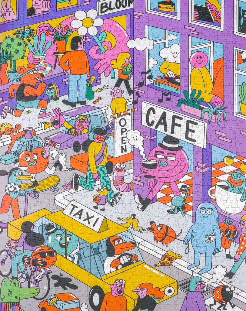 City living at it's finest. German artist Sarah Matuszewski's cityscape is filled with unique characters and busy streets in her colorfully iconic style. This scratches an itch we didn't know we had. Subtly detailed, the harder you look the more you'll find in this super fun puzzle.