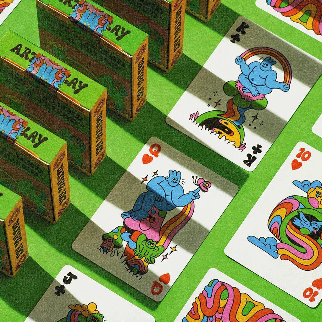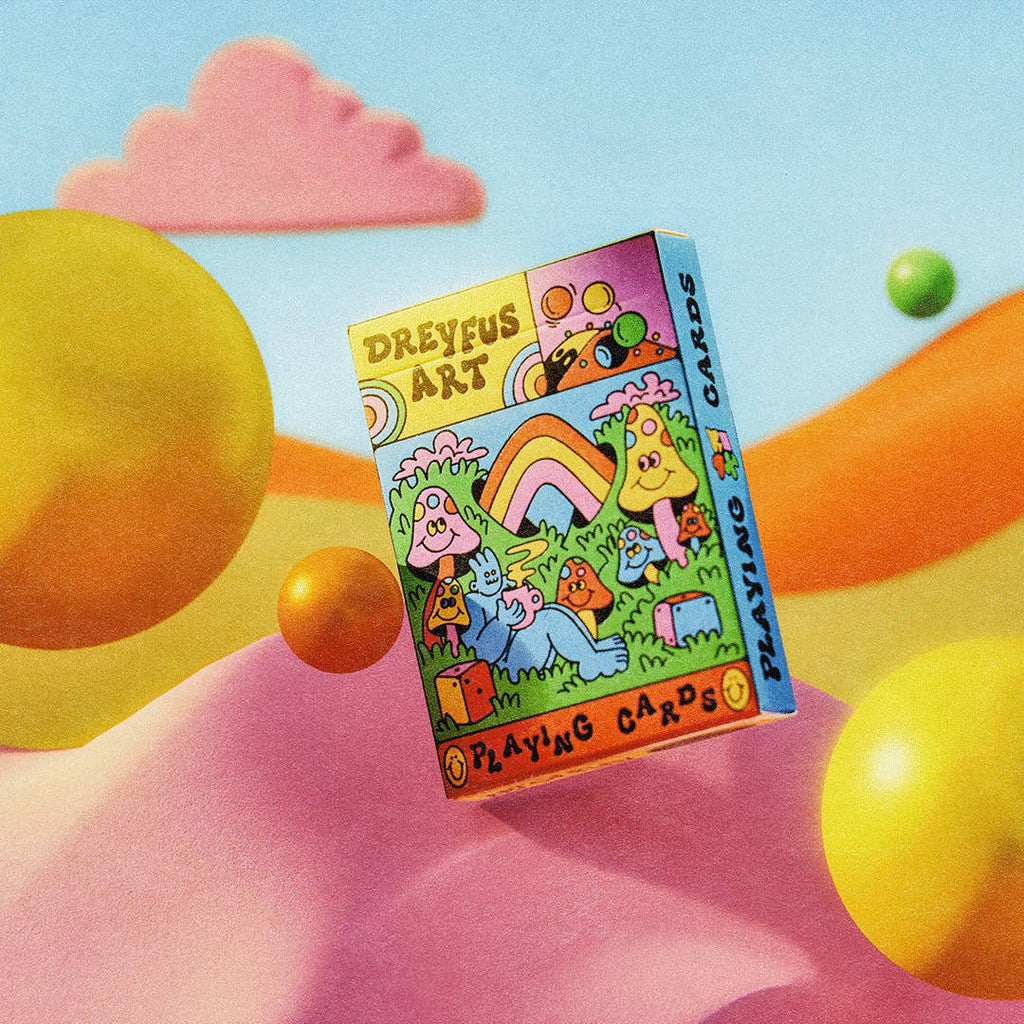 Produced in collaboration with the wildly imaginative illustrator Ashley Dreyfus this fully custom deck of cards features a colorful cast of characters drawn in a whimsical, psychedelic style.