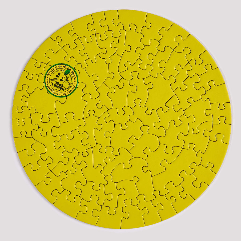 A round solid-yellow 81-piece mini puzzle that take takes inspiration from other flat yellow things like a child's drawing of the sun, yellow lights and a puddle of lemonade.