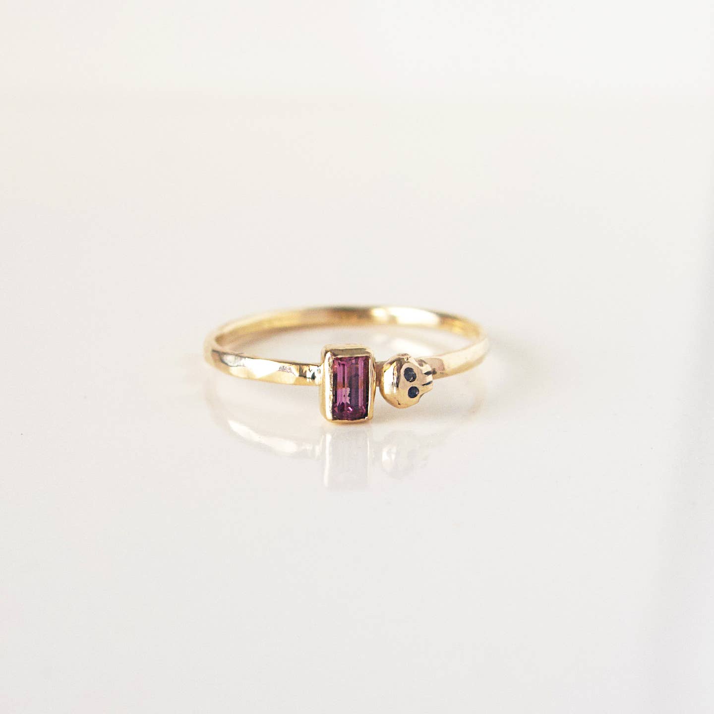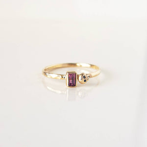 House of Snakes' Little Gold Spinel Skull Ring is hand made in solid 10k gold with natural bright pink spinel bezel set next to a hand carved tiny skull. Perfectly delicate little ring and great for stacking.