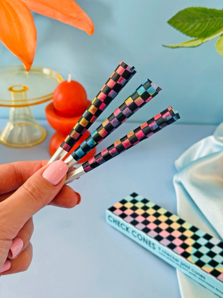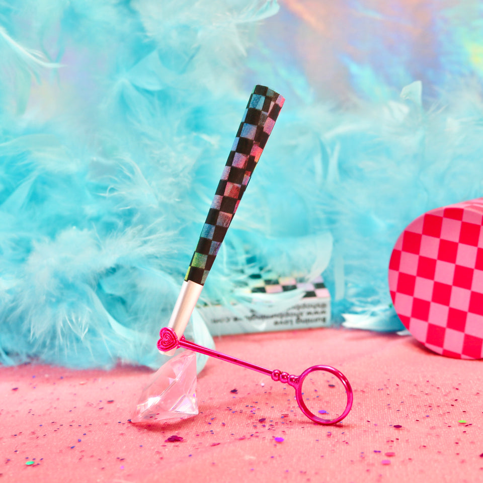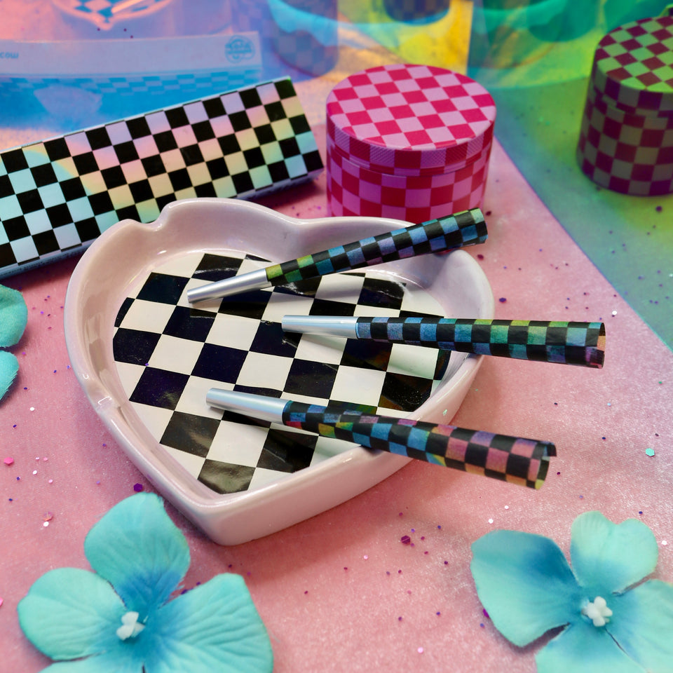 Classic checkerboard with a fun rainbow running through and a fun silver tip!