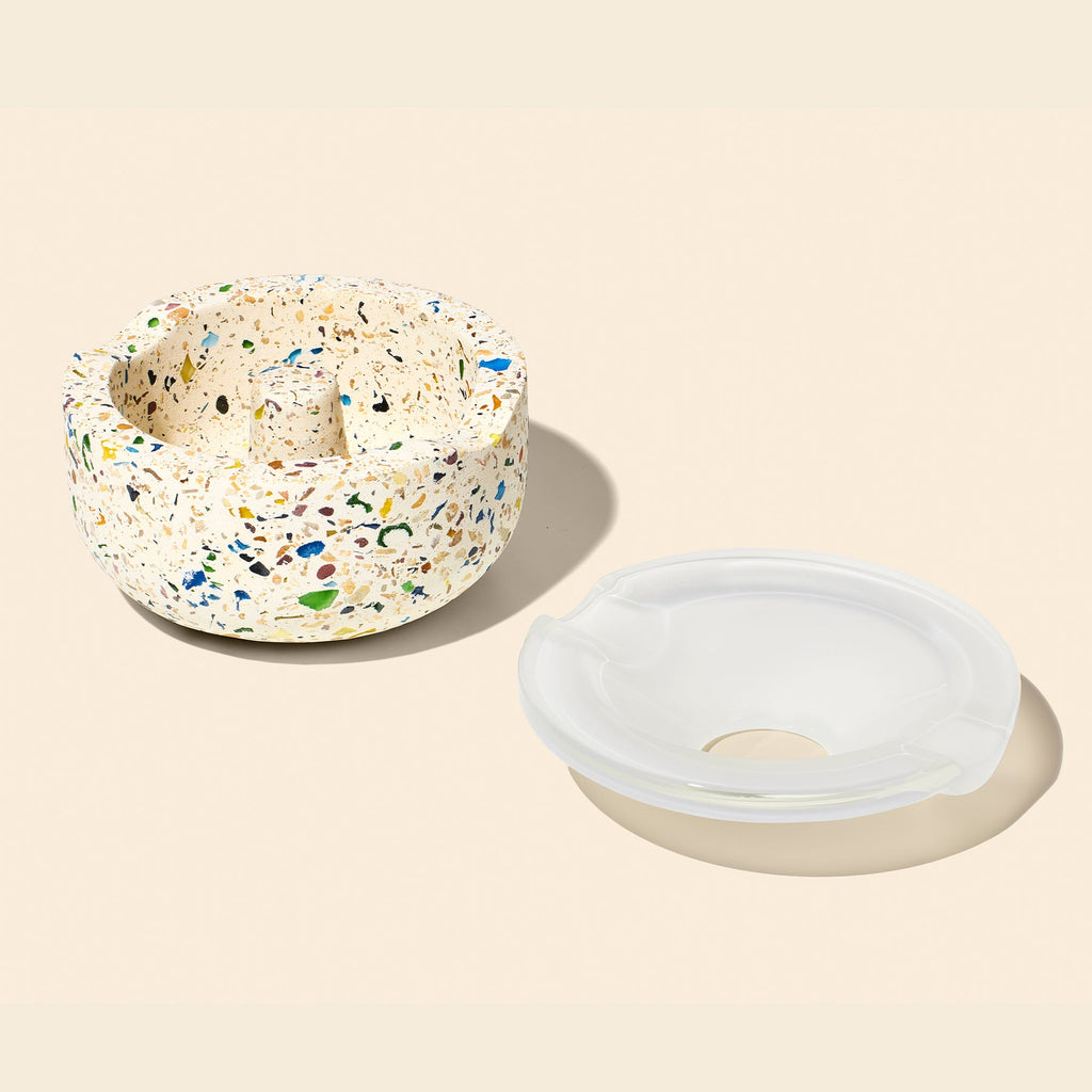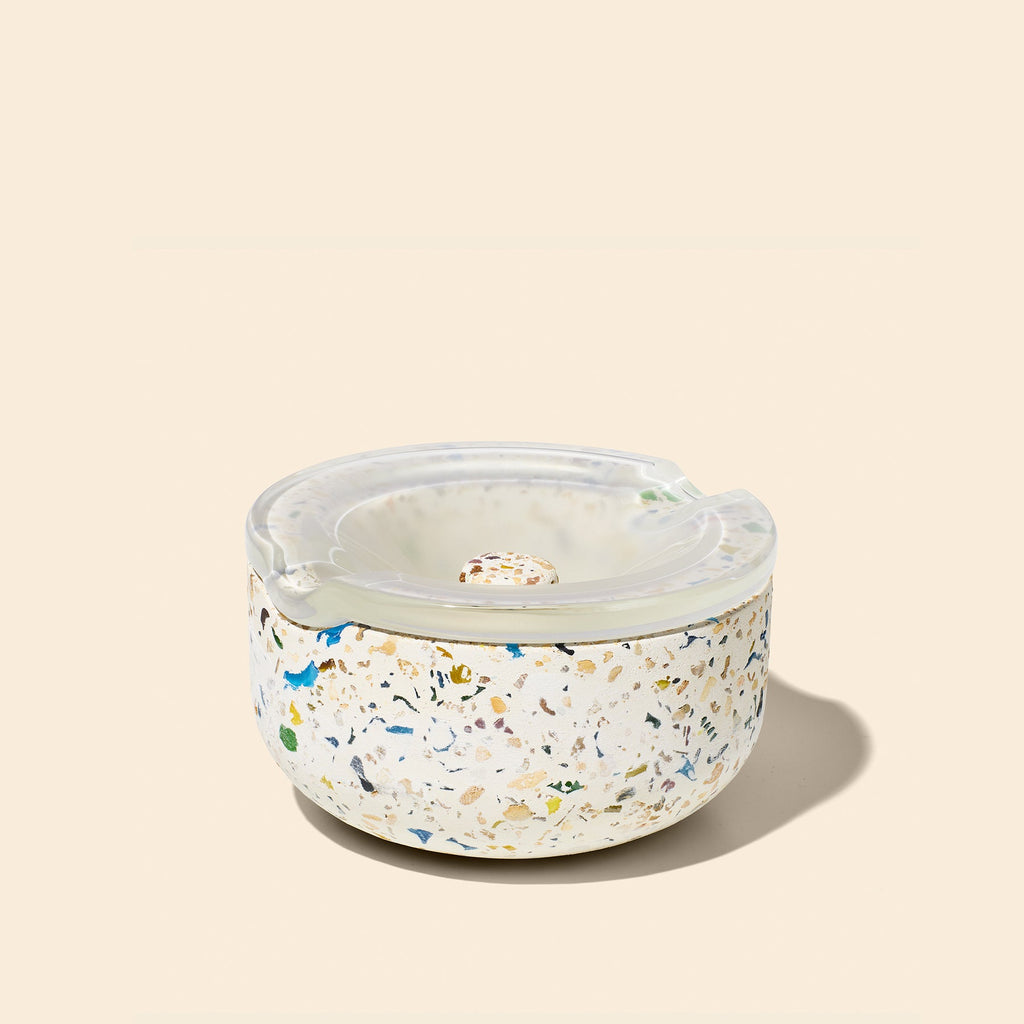 The NWTN Home Symi Ashtray blends vintage-inspired design with modern materials. Featuring a terrazzo base made from recycled glass, a removable borosilicate glass top, and thoughtfully placed grooves to keep essentials in place, added silicone footing for shock-absorption—bringing refined function to a timeless form.