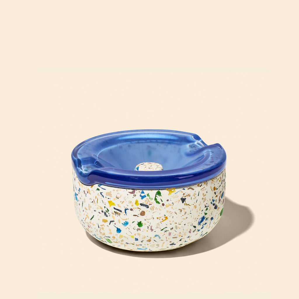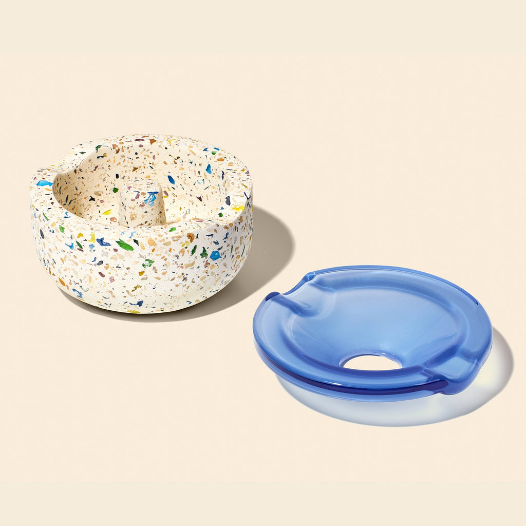 The NWTN Home Symi Ashtray blends vintage-inspired design with modern materials. Featuring a terrazzo base made from recycled glass, a removable borosilicate glass top, and thoughtfully placed grooves to keep essentials in place, added silicone footing for shock-absorption—bringing refined function to a timeless form.