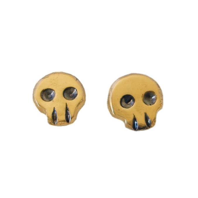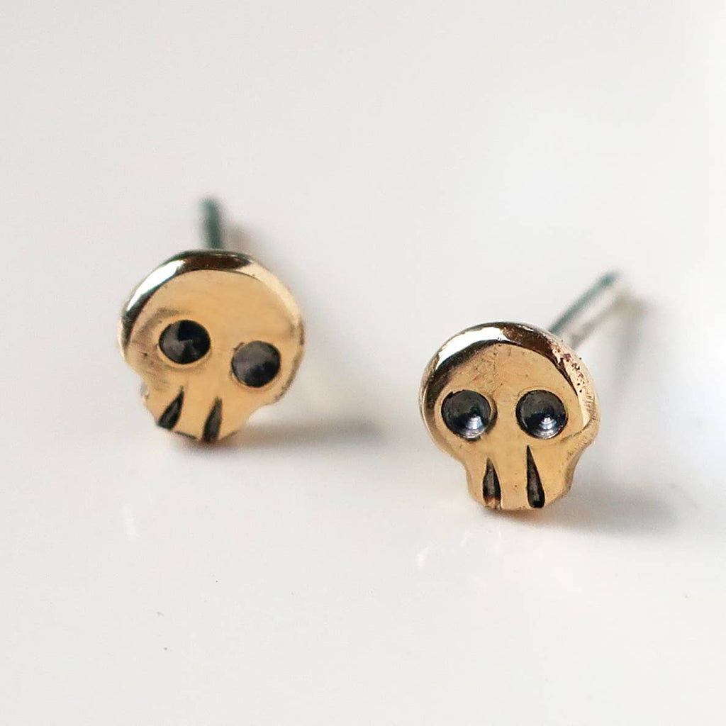 House of Snake's cute little Skull Studs are carved by hand in 10K Gold with Sterling Silver backs. These tiny cute little studs are about 3/16" wide and a perfect everyday pair of studs. All pieces are handmade using fair mined and recycled precious metals and natural gemstones.
