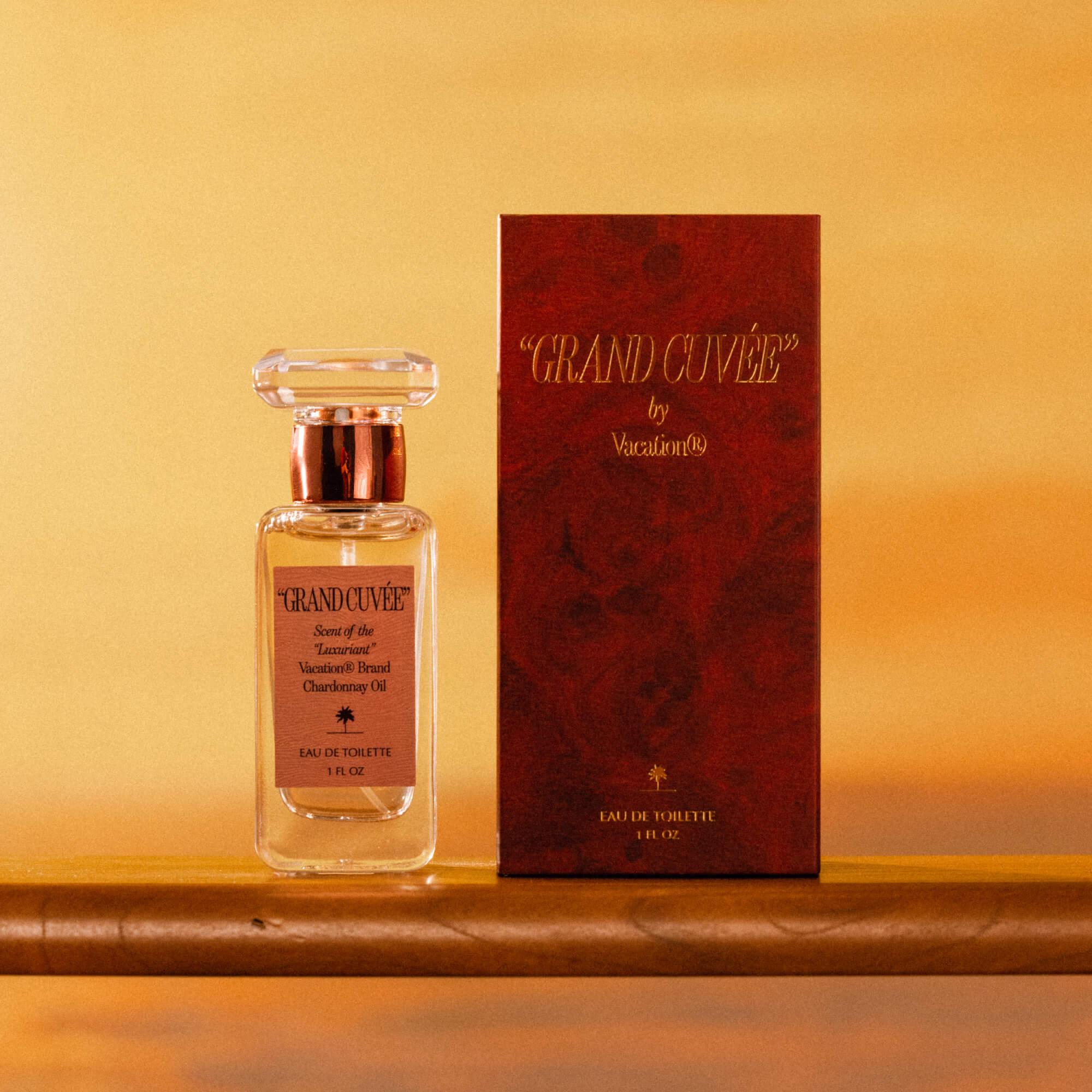 The signature scent of the “Luxuriant” Vacation® Brand Chardonnay Oil, “GRAND CUVÉE” by Vacation® is a ceremonious toast to the finer things in life, rich with notes of Argan, Amber, Vanilla Bean, Peach Eau de Vie and an oceanic hint of Sun-Washed Sails.