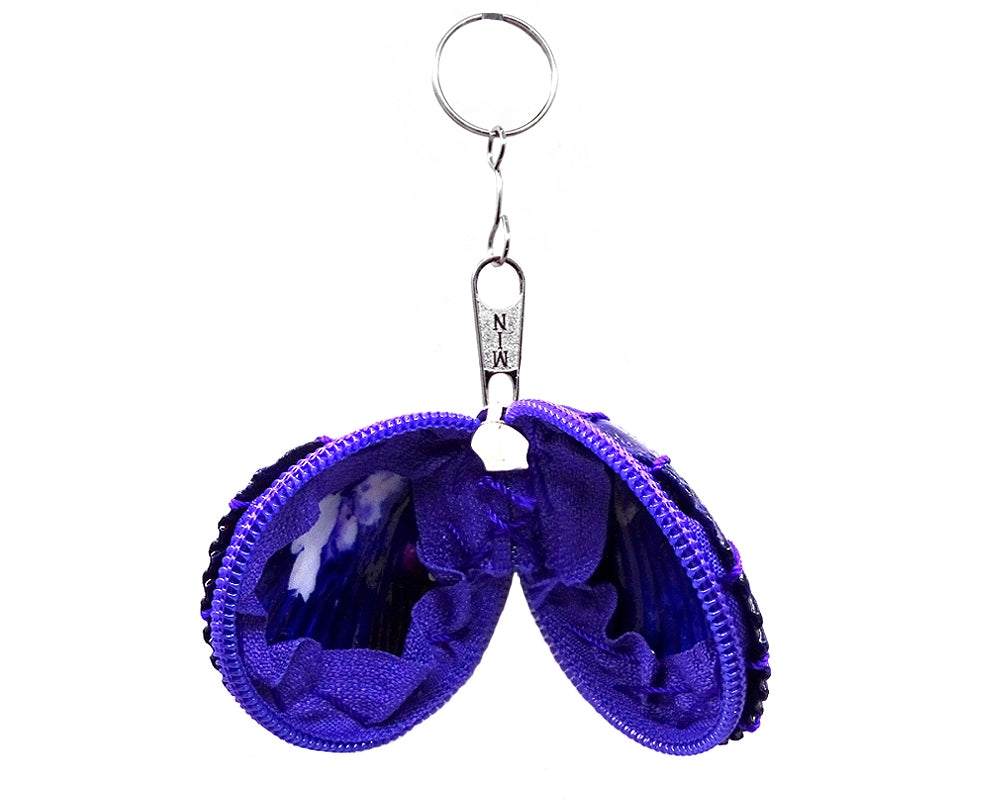 Handcrafted natural dyed seashell coin purse on a silver metal key ring.