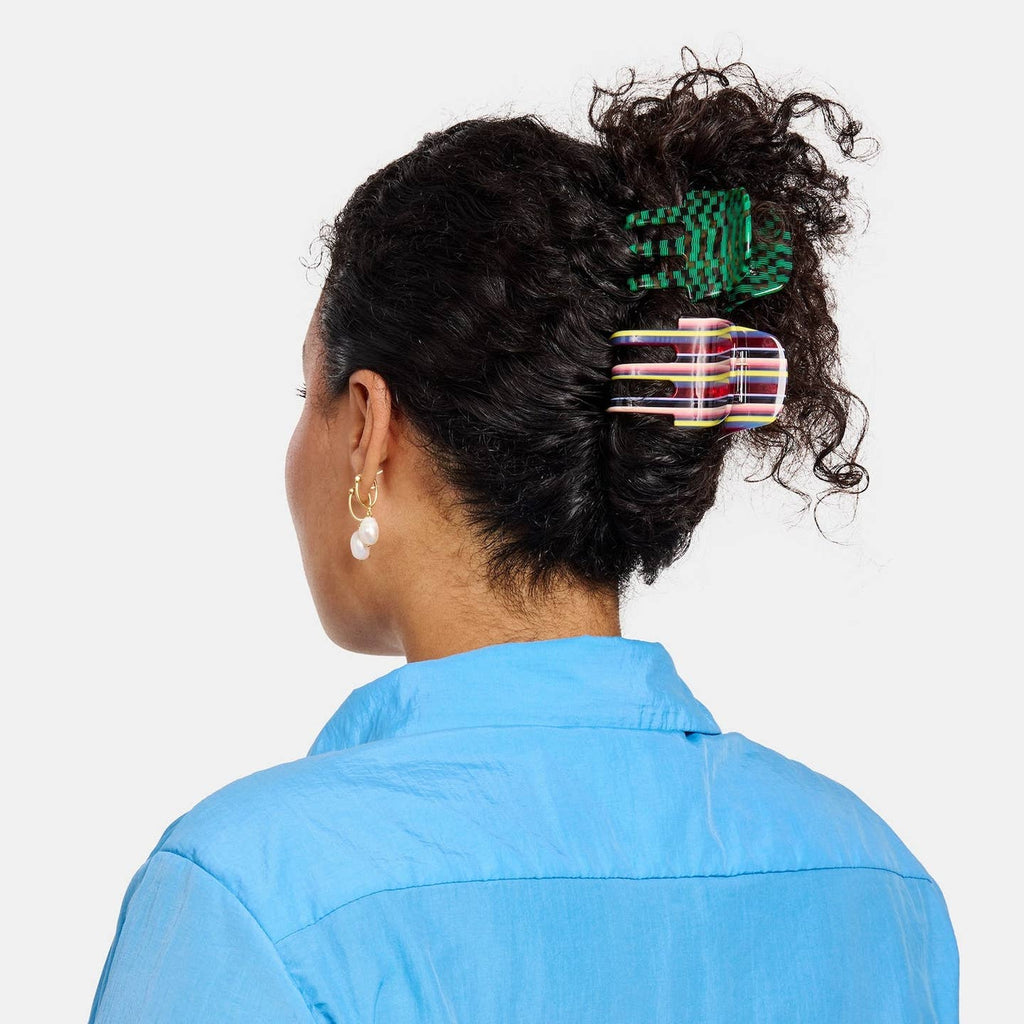 This medium sized claw is uniquely perfect for curly, textured, medium to thick hair. Large teeth give a gentle but firm hold, without crushing curls. Made from high quality acetate; a durable, plant based bio-plastic. Metal hardware is lead and nickel-free.