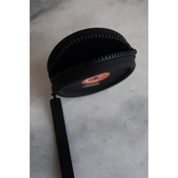 Super nifty round zipper pouch (wristlet! coin purse! key container! secret little stash bag! world's cutest retainer case?) made of food grade silicone with a satisfyingly chunky plastic zipper and coordinating wrist strap.